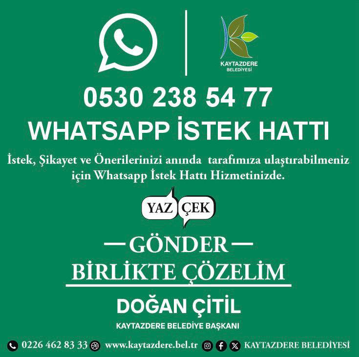 0530 238 54 77 WHATSAPP İSTEK HATTI İstek, Şikayet ve Önerilerinizi anında tarafımıza ulaştırabilmeniz için istek hattı hizmetinizde. Gönderin Birlikte Çözelim… DOĞAN ÇİTİL KAYTAZDERE BELEDİYE BAŞKANI